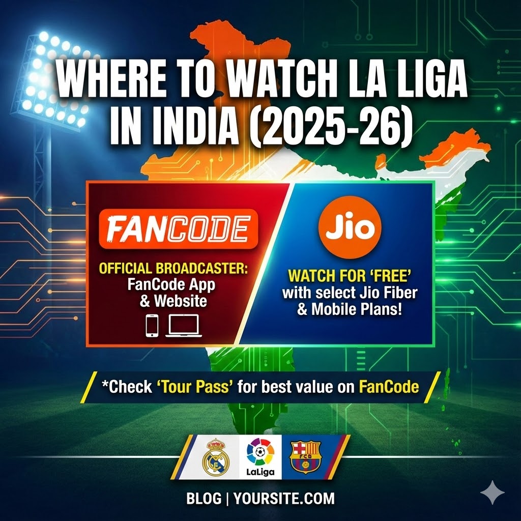 For the 2025-26 season, FanCode is the exclusive official broadcaster for La Liga in India. You can watch all 380 matches, including El Clásico and the Madrid Derby, live on their app and website.